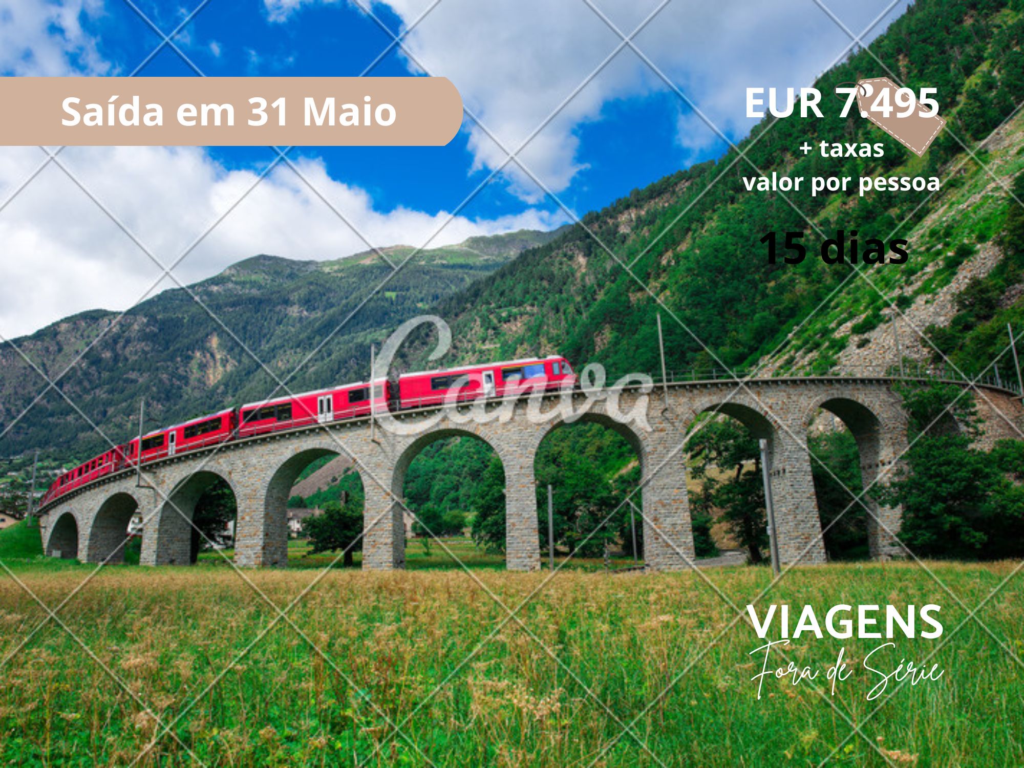 - Na Suíça, travessia dos Alpes no famoso trem panorâmico Bernina Express e pernoite em Saint Moritz. Na Áustria, visita a Innsbruck, Capital do Tirol nos Alpes Austríacos.