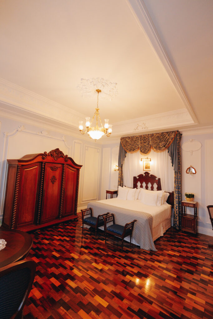 - As novas suítes Royal são inspiradas na elegância da decoração portuguesa e se destacam, sobretudo, pela riqueza de detalhes, como afrescos em gesso, pé-direito alto, cortinas em jacquard de seda e lustres de cristal. Além disso, a experiência é completada por móveis originais de época, cama king size e uma curadoria de conforto que inclui amenities Trousseau Italian Provence, lençóis portugueses de 400 fios, toalhas Trousseau, travesseiros de plumas e roupões em piquet. Na sala de banho, a banheira vitoriana em pedra vulcânica, combinada a metais dourados, adiciona um charme especial e reforça o caráter exclusivo da hospedagem. Para completar, o café da manhã personalizado está incluso e pode ser servido no quarto, no solarium ou no jardim até as 12h. A suíte possui aproximadamente 45 m², oferecendo espaço, conforto e uma experiência verdadeiramente diferenciada.
